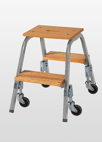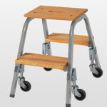 150 mm tiefe Stufen, lasiert; Deckbrett mit Grifföffnung, Holme aus Stahl,