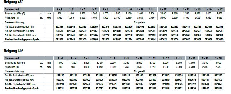 (Stufentiefe 240 mm bei 45° und 185 mm bei 60° Neigung)
